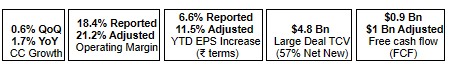 “Our performance was broad-based in Q3 with 0.6% sequential revenue growth, 0.2% adjusted operating margin expansion, stellar large deal wins at $4.8 billion and robust adjusted free cash generation at $965 million in a seasonally weak quarter,” said Jayesh Sanghrajka, CFO. “In line with our capital allocation policy, we successfully completed the largest ever buyback of `18,000 crore and paid out interim dividend to shareholders,” he added.