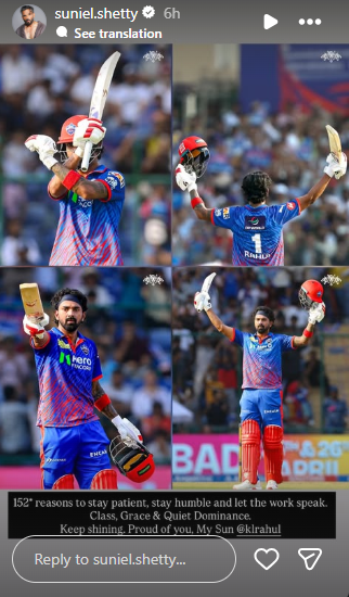 Suniel Shetty shared pictures of KL Rahul from the match on Instagram and said, “152 reasons to stay patient, stay humble and let the work speak. Class, Grace & Quiet Dominance. Keep shining. Proud of you. My Sun @klrahul.”
