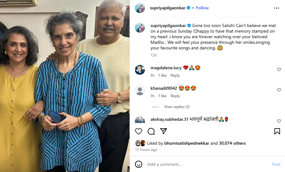 “Gone too soon Satish! Can’t believe we met on a previous Sunday! Happy to have that memory stamped on my heart. I know you are forever watching over your beloved Madhu. We will feel your presence through her smiles. Singing your favourite songs and dancing,” she posted.
