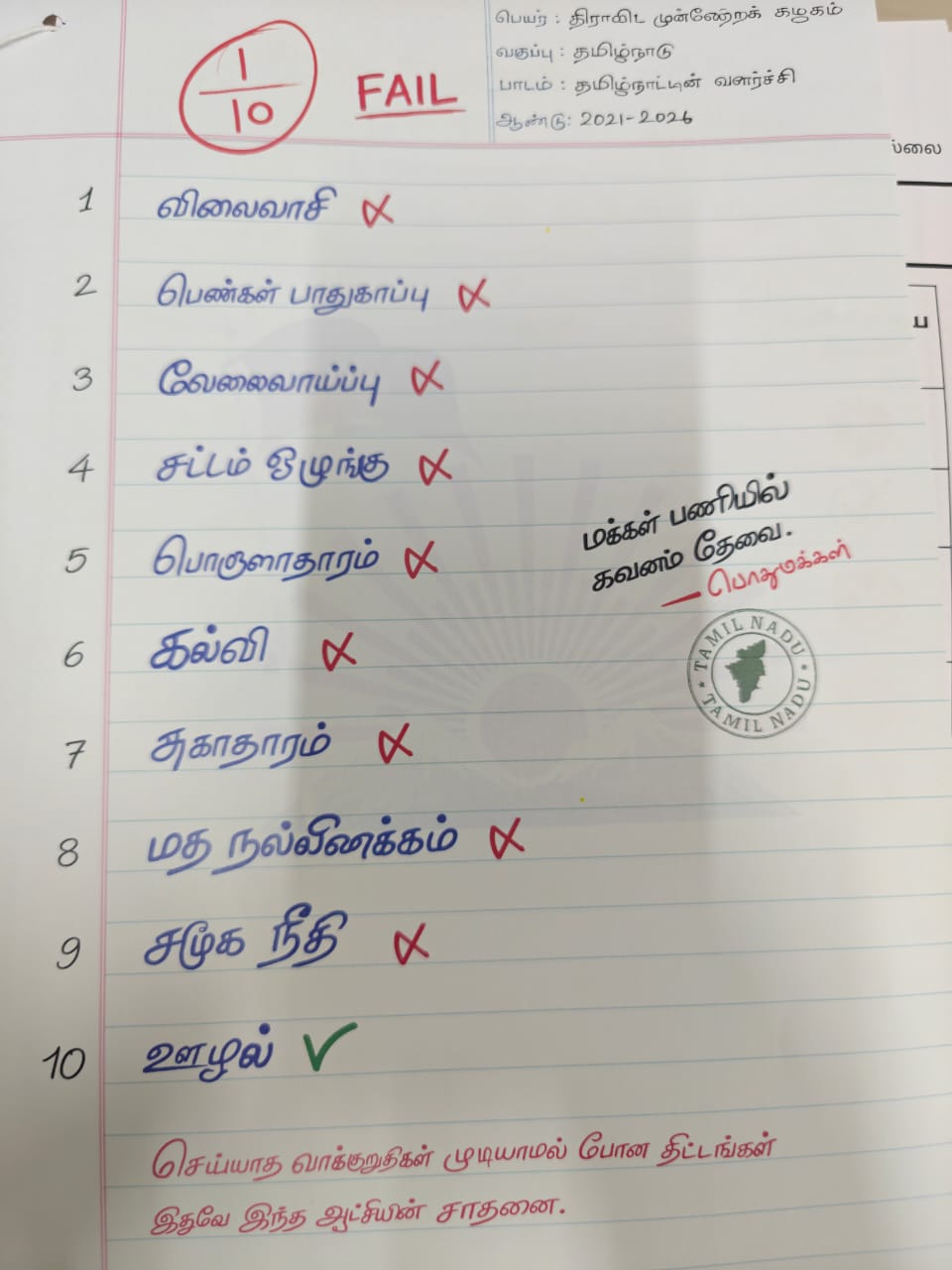 Highlighting the promises made by the DMK government, the BJP released the statistical “report card” resembling an exam score sheet. The report was released and criticised within the Assembly premises by BJP MLA Nainar Nagendran.