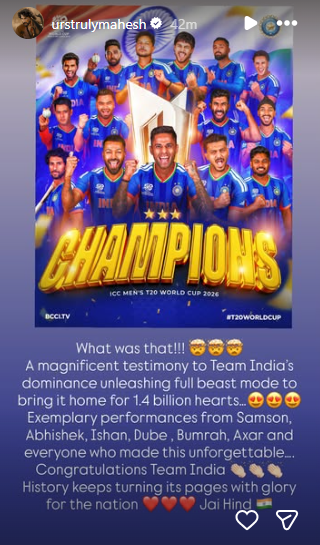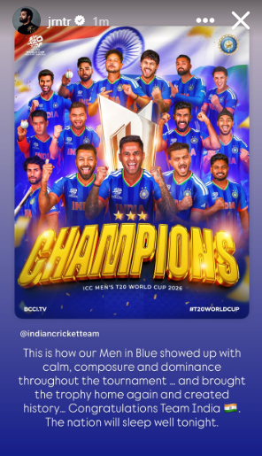 Jr NTR wrote, “This is how our Men in Blue showed up with calm, composure, and dominance throughout the tournament…and brought the trophy home again and created history. Congratulations Team India. The nation will sleep well tonight.”