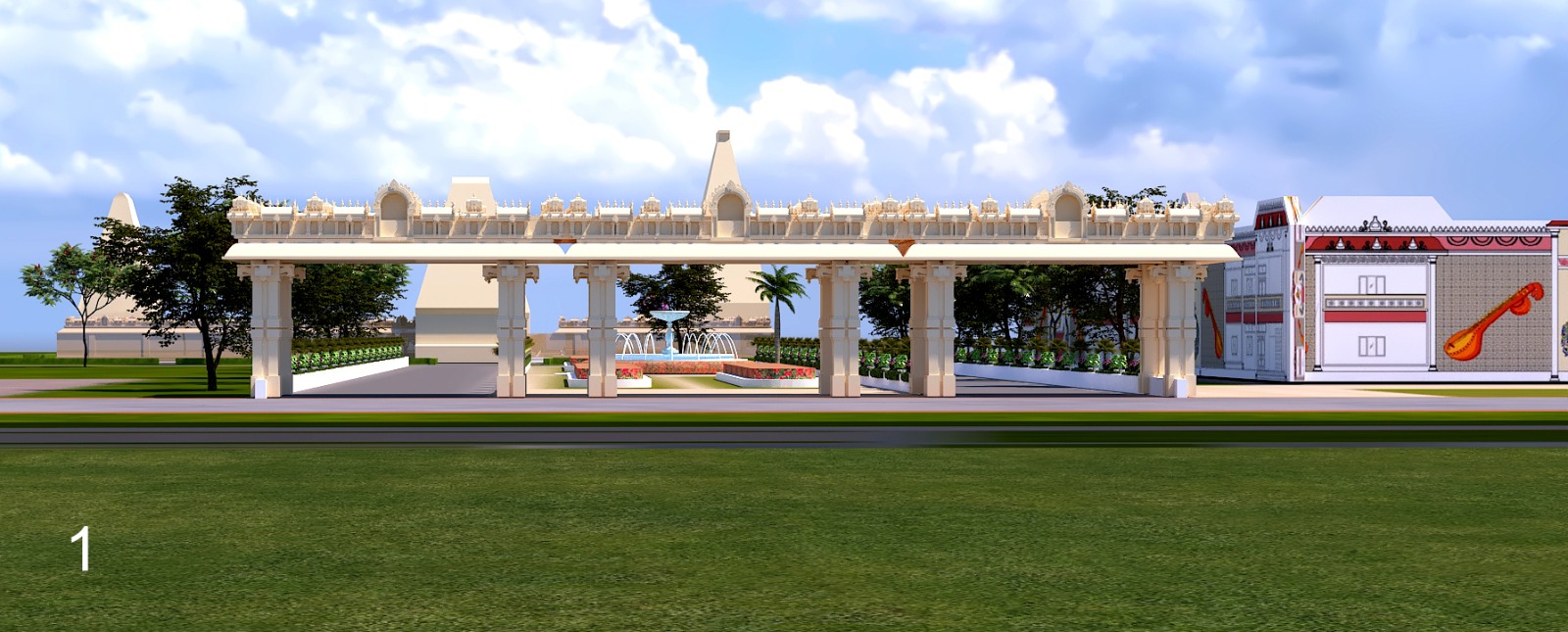 A sacred pond (Koneru) situated in the northeast corner, magnificent ornamental arches, designed to radiate a spiritual aura, will also be erected on the eastern side, alongside an information centre. Road development works will be undertaken to the north and east of the temple. An underpass will be constructed to facilitate movement from the temple premises to the opposite side. A vehicle parking facility with a solar rooftop will be established on the other side.