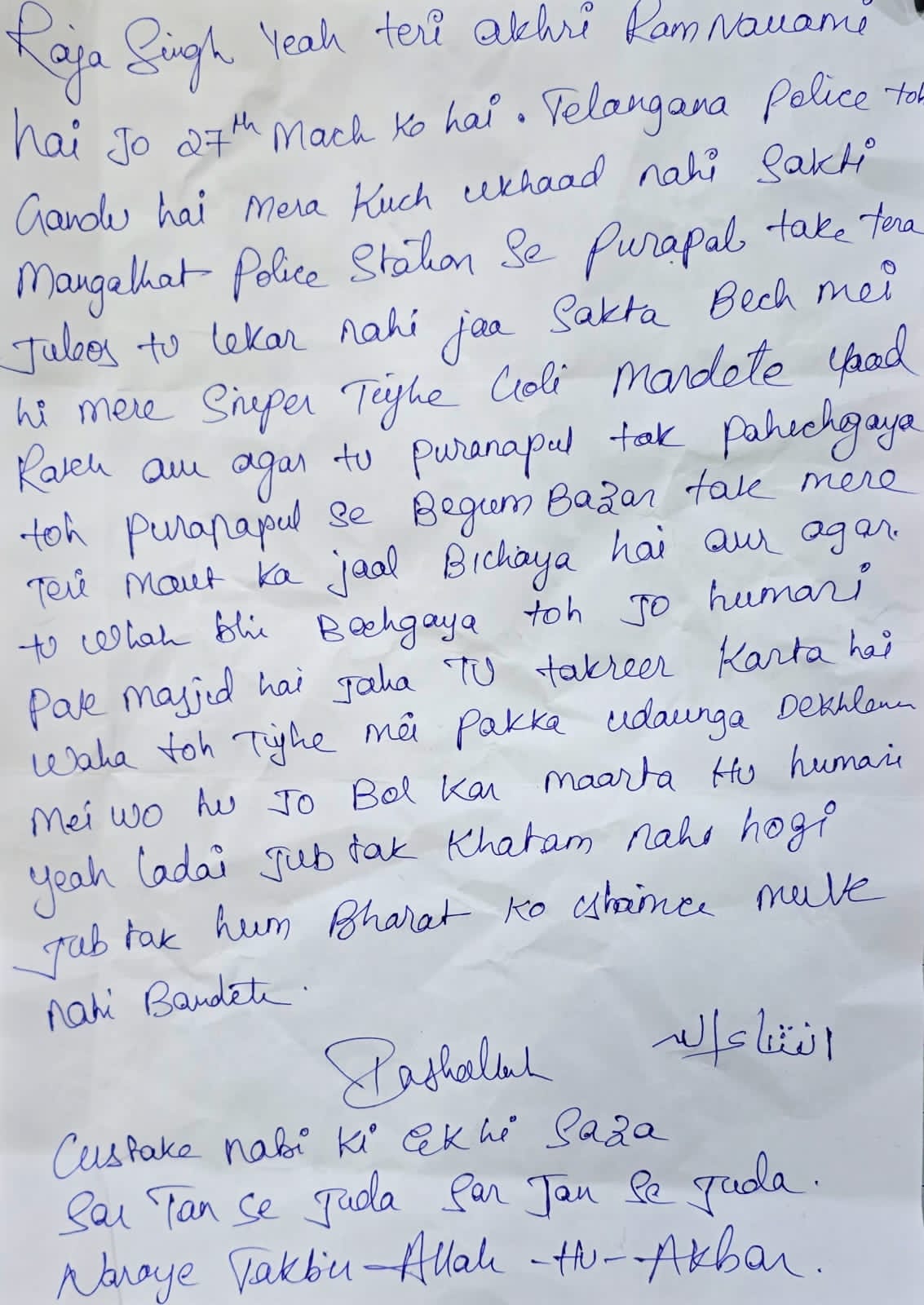 The letter cited,” Raja Singh, this will be your last Ram Navami on March 27. The Telangana Police cannot do a thing to me.”