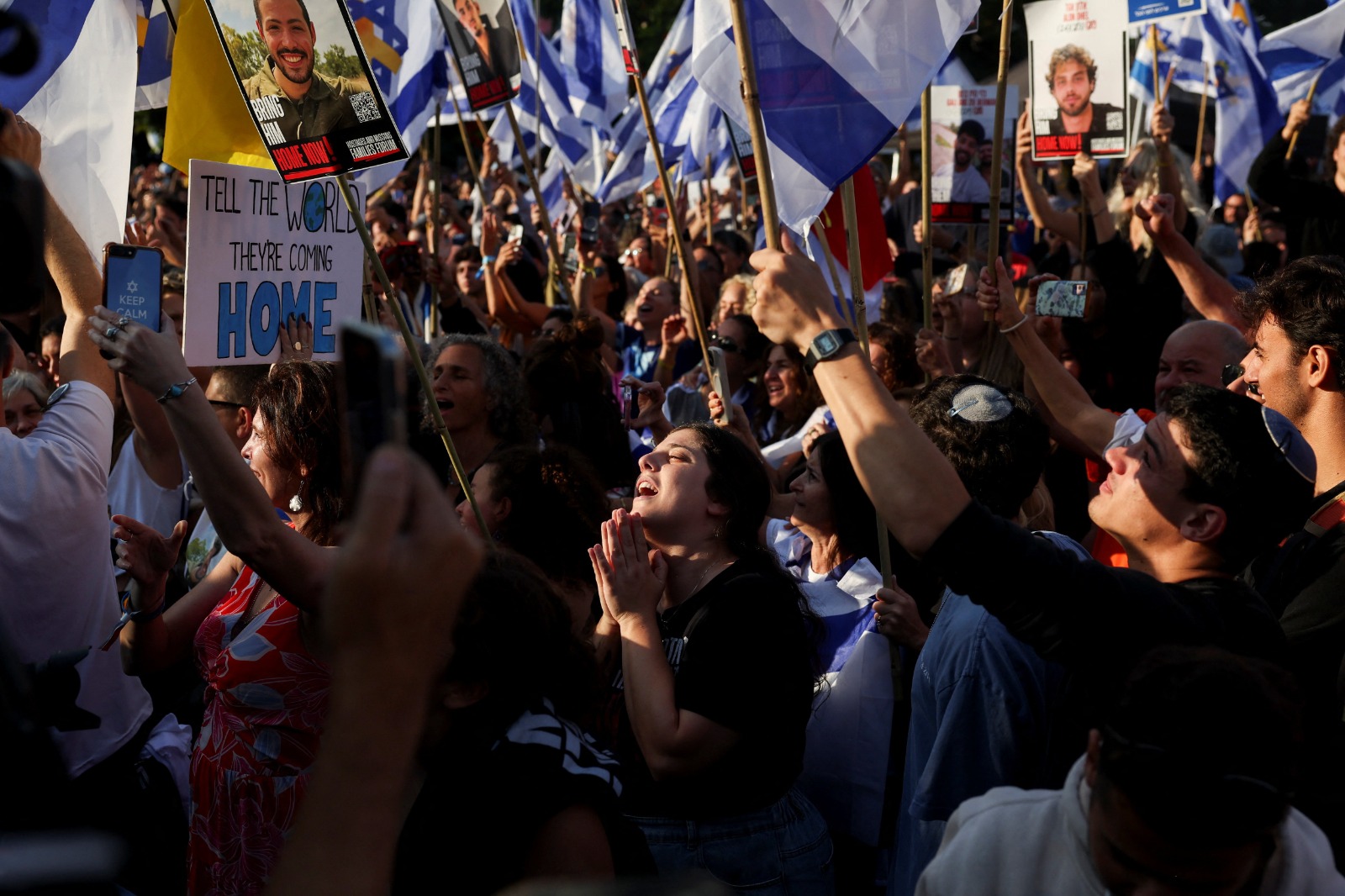 In Tel Aviv’s Hostages Square and along roads in southern Israel near the Gaza border, hundreds of people assembled, waving flags and holding photos of the captives.