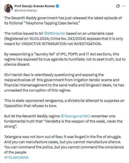 “The Revanth Reddy government has just released the latest episode of its fictional ‘Telephone Tapping Case Series’. The notice issued to Sri @BRSHarish based on an untenable case (Registered on 10.03.2024; Crime No. 243/2024) exposes that it is only meant for VINDICTIVE INTIMIDATION, not INVESTIGATION,” he wrote.