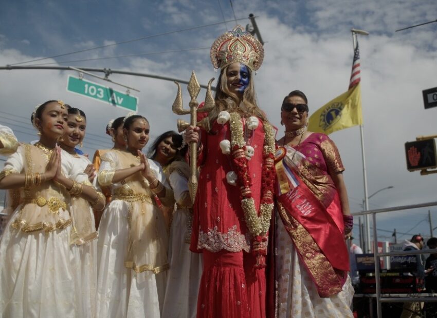 The 38th Annual Phagwah Parade in Richmond Hill, Queens, New York, witnessed Assembly Member Jenifer Rajkumar dressed in a red traditional dress, with a crown on her head, a trishul or trident in her right hand, and with the left side of her face painted dark. The Assemblywoman, the first Hindu American elected to New York State Office, has also been a Grand Marshall of the parade in the past.