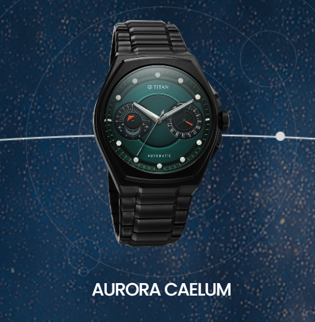 The third standout–and the one I’ve had the pleasure of wearing–is the Aurora Caelum (INR 95,995). Photos do not do justice to the dial of this watch; it is reminiscent of the Northern Lights framing astral discs in harmonious motion. Wearing it truly exhibits luxury. The build quality is exceptional, utilising a complex, multi-piece Grade-5 Titanium case and bracelet that offer a surprising blend of extreme lightness and robust strength. The case edges feature sophisticated Zaratsu polishing, a technique rarely seen at this price point. Powered by Titan’s in-house Automatic 7AM32E calibre, the watch brings to life a classical Sun-Moon phase display, protected by a sapphire crystal. It is a subtle yet crucial detail I noticed, but thanks to an effective anti-reflective coating, the dial remains perfectly legible, free of glare from almost any viewing angle. The experience is rounded off by an exhibition case back revealing a customised rotor, underscoring the deep design story and engineering mastery involved.