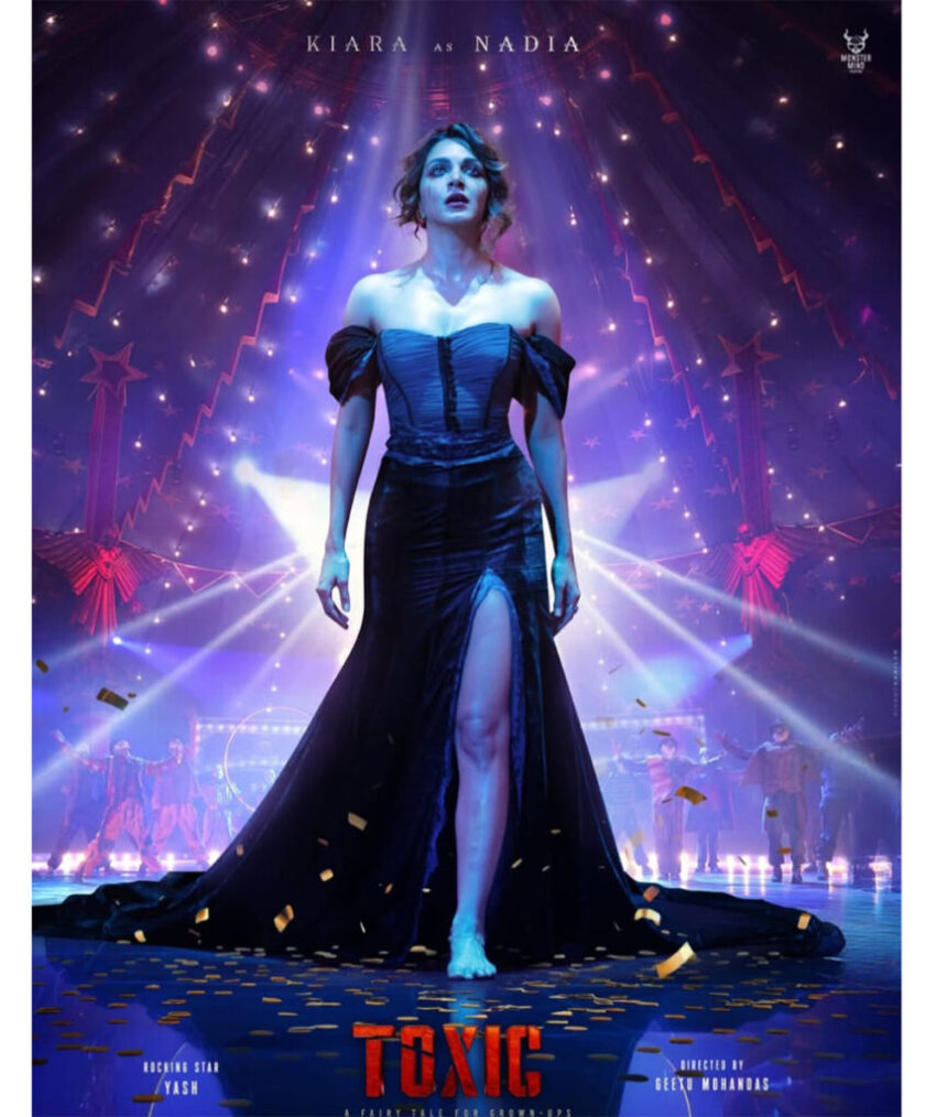 Yash shared a striking first-look poster on Instagram introducing Kiara’s character. In the poster, Kiara is seen wearing a black off-shoulder gown with a thigh-high slit. She stands under a spotlight on a dance floor, looking away from the camera, with tears on her face.