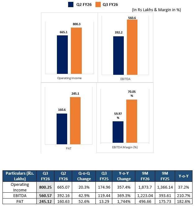 Revenue from operations reached Rs. 800.25 lakhs, up 20% QoQ and 357% YoY. For the nine months ended December 2025, our revenue stood at Rs. 1,873.70 lakhs, up 37% YoY, translating to an annualized revenue run rate of Rs. 48 crores.