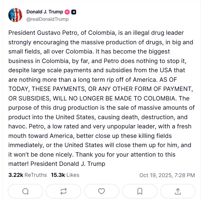 Highlighting the impact of the drug production, Trump said its main goal is “the sale of massive amounts of product into the United States, causing death, destruction, and havoc.” He described Petro as a “low rated and very unpopular leader, with a fresh mouth toward America,” warning that immediate action is required.