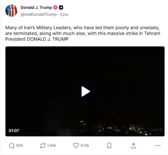 In his statement, Trump noted, “Many of Iran’s Military Leaders, who have led them poorly and unwisely, are terminated, along with much else, with this massive strike in Tehran!”