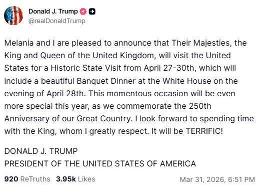 “Melania and I are pleased to announce that Their Majesties, the King and Queen of the United Kingdom, will visit the United States for a Historic State Visit from April 27-30th, which will include a beautiful Banquet Dinner at the White House on the evening of April 28th. This momentous occasion will be even more special this year, as we commemorate the 250th Anniversary of our Great Country. I look forward to spending time with the King, whom I greatly respect. It will be TERRIFIC!”, he wrote.