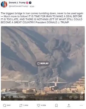 He made the remarks in a post on Truth Social and shared a video clip which showed a bridge coming down.