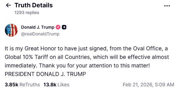 “Effective immediately, all the national security tariffs under Section 232 and existing Section 301 tariffs remain in place… Today, I will sign an order to impose a 10% global tariff under Section 122 over and above our normal tariffs already being charged,” he said.