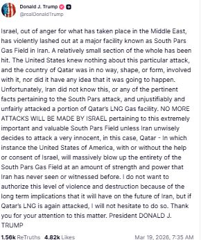 “The United States knew nothing about this particular attack, and the country of Qatar was in no way, shape, or form, involved with it, nor did it have any idea that it was going to happen. Unfortunately, Iran did not know this, or any of the pertinent facts pertaining to the South Pars attack, and unjustifiably and unfairly attacked a portion of Qatar’s LNG Gas facility. NO MORE ATTACKS WILL BE MADE BY ISRAEL pertaining to this extremely important and valuable South Pars Field unless Iran unwisely decides to attack a very innocent, in this case, Qatar – In which instance the United States of America, with or without the help or consent of Israel, will massively blow up the entirety of the South Pars Gas Field at an amount of strength and power that Iran has never seen or witnessed before. I do not want to authorize this level of violence and destruction because of the long term implications that it will have on the future of Iran, but if Qatar’s LNG is again attacked, I will not hesitate to do so. Thank you for your attention to this matter. President DONALD J. TRUMP”