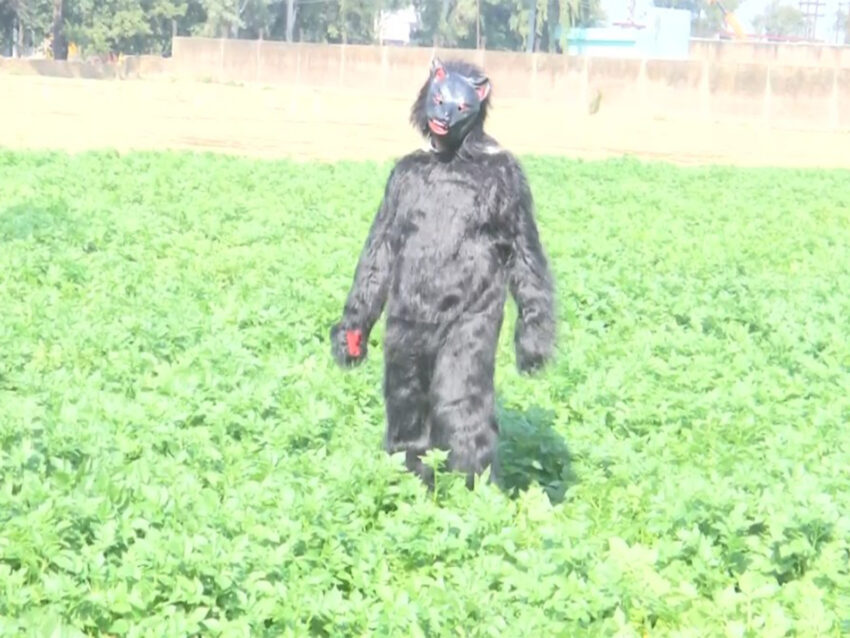 Sambhal (Uttar Pradesh) [India], March 16 (ANI): To protect their crops from destruction, farmers in Sambhal district have taken to wearing bear costumes to scare away troublesome monkeys at Firozpur village.