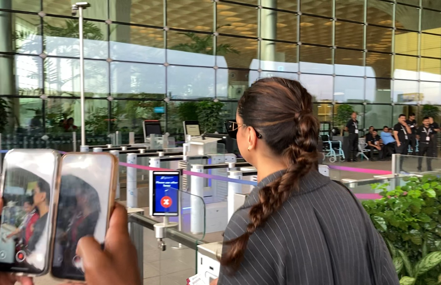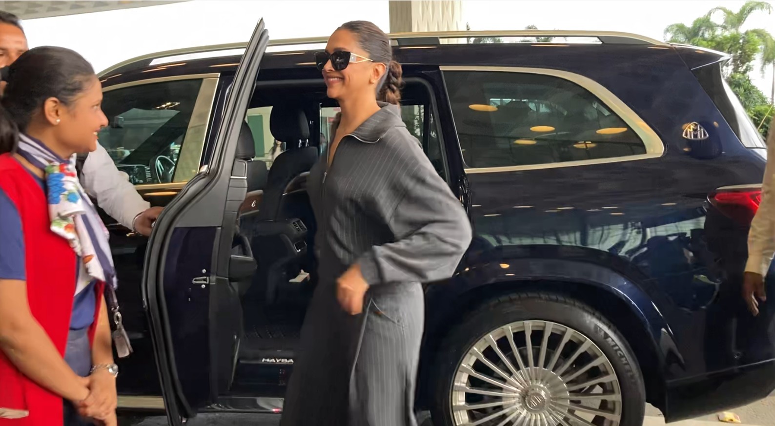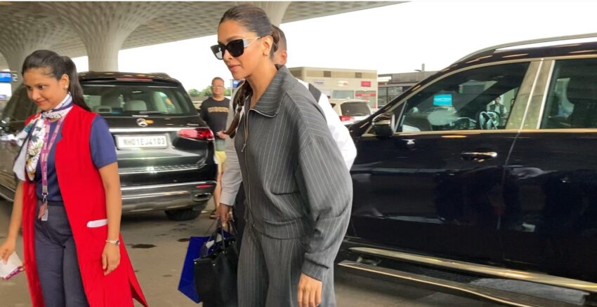 Deepika, known for her effortless airport style, opted for a grey co-ord set featuring a collared zip-up jacket paired with trousers. She complemented the look with minimal accessories — small earrings, black sunglasses, and a neatly tied bun.
