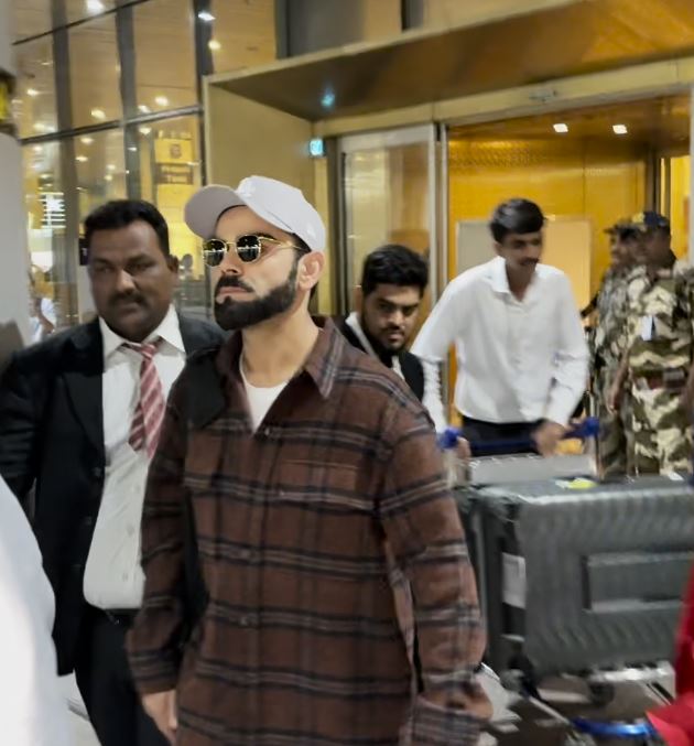 The star Indian batter donned casual wear for the flight, including black trousers, a white T-shirt, and a brown checked shirt. He complemented his outfit with black sunglasses and a cap.