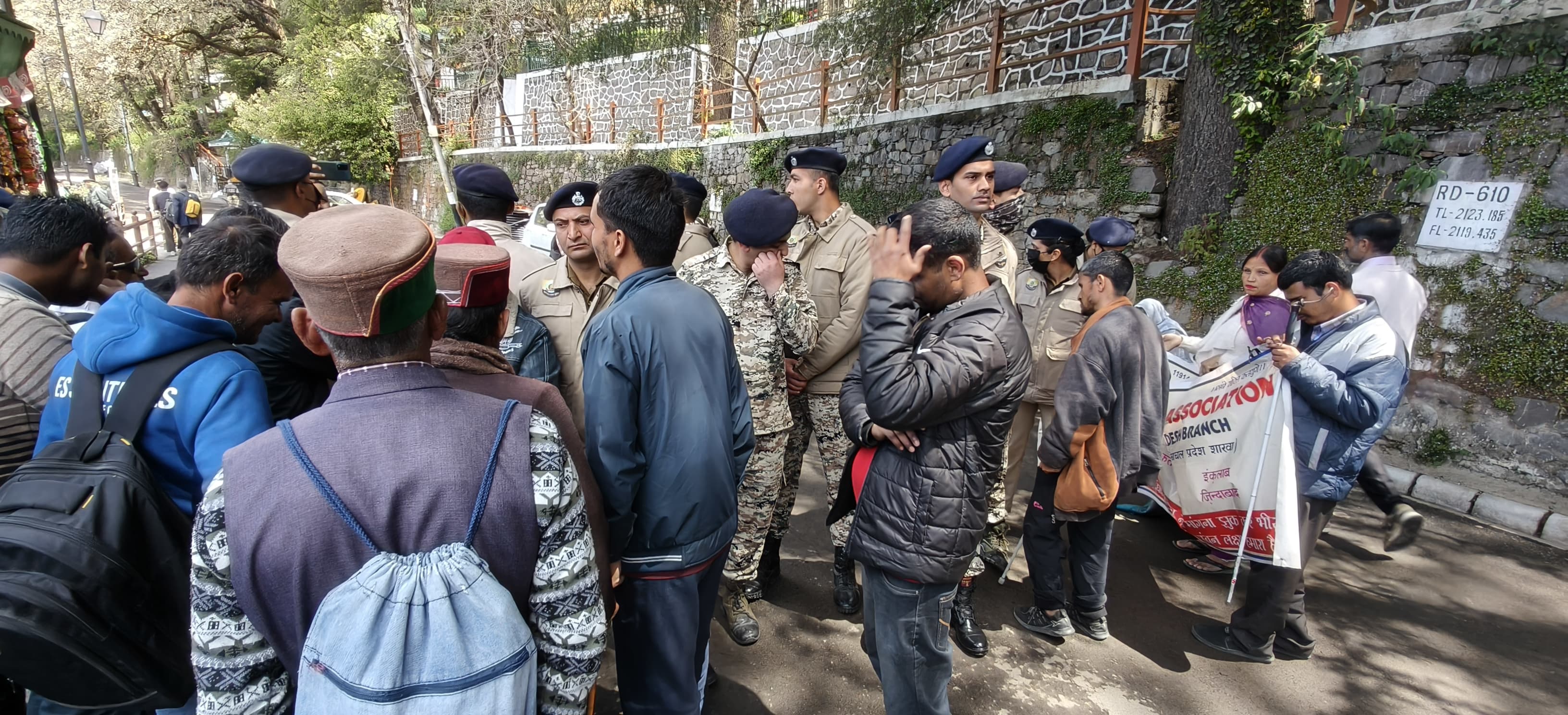 Shimla (Himachal Pradesh) [India], April 6 (ANI): A group of visually impaired protesters under the banner of the Himachal Pradesh Blind and Visually Impaired Association, on Monday, stopped by police while marching towards the Chief Minister’s residence in Shimla, intensifying their long-pending agitation over job reservations and pension issues.