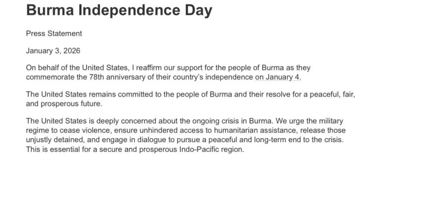 “The United States is deeply concerned about the ongoing crisis in Burma. We urge the military regime to cease violence, ensure unhindered access to humanitarian assistance, release those unjustly detained, and engage in dialogue to pursue a peaceful and long-term end to the crisis,” the US Department of State said in a statement issued on the occasion of Burma’s Independence Day.