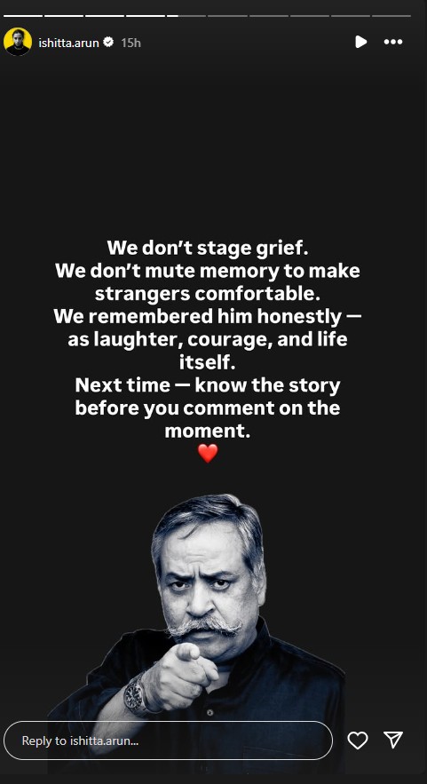 Now, Ishitta herself has responded to the backlash. Taking to Instagram on Sunday, the actor hit back at the trolls, saying that grief cannot be “scripted” or performed for others’ comfort. In her note, she explained that her emotions came from a place of love and memory, not disrespect.