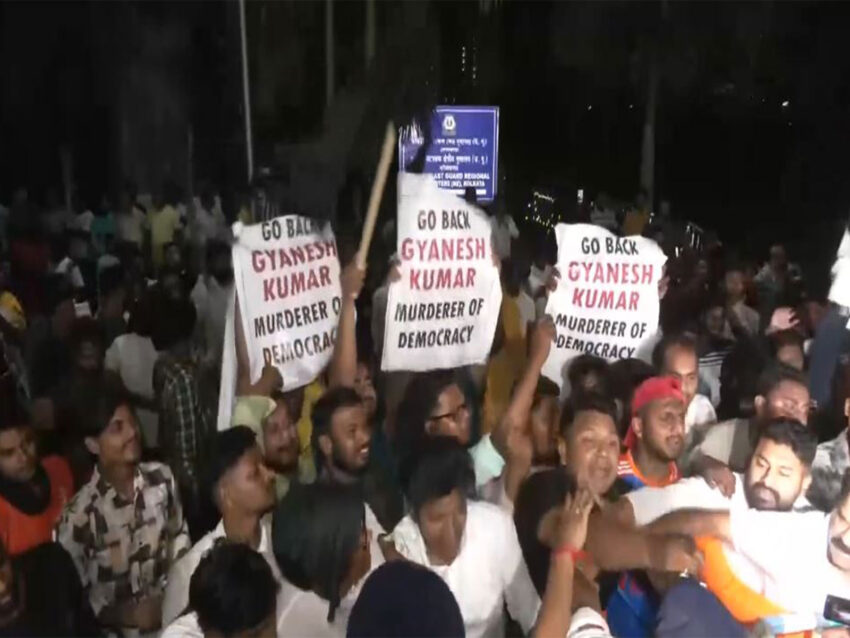 New Town (West Bengal) [India], March 8 (ANI): The West Bengal locals on Sunday gathered infront of a private hotel in New Town, wearing posters on their chest that read ‘Go back, Gyanesh Kumar, murderer of democracy’ as the Chief Election Commissioner (CEC) Gyanesh Kumar along with Election Commissioners SS Sandhu, Vivek Joshi and Senior Deputy Election Commissioenrs Maneesh gard and Pawan Kumar arrived at the Kolkata Airport along with CEC Gyanesh Kumar.