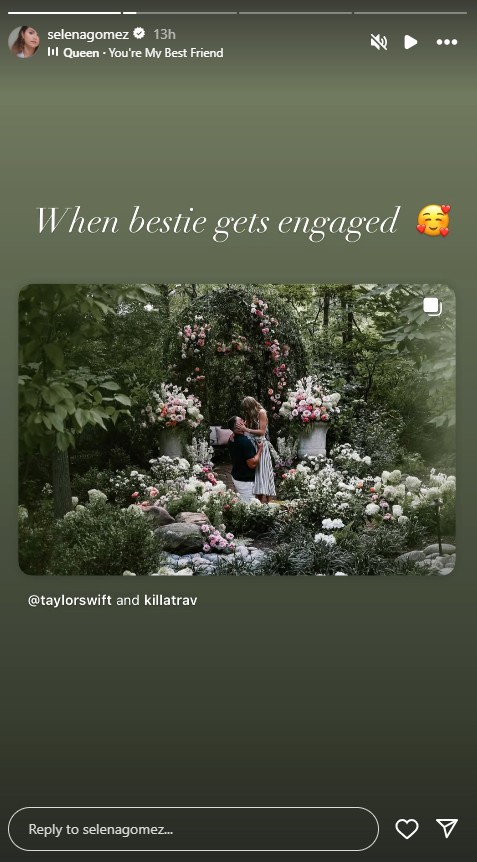 “When bestie gets engaged,” Selena wrote on her Instagram Story alongside photos from the garden engagement, E! News reported.