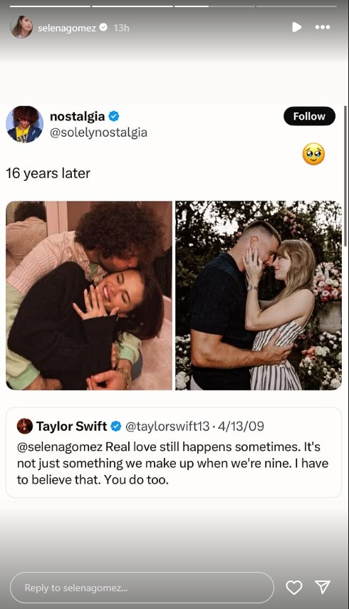 “Real love still happens sometimes. It’s not just something we make up when we’re nine. I have to believe that. You do too.” A fan reposted the message, accompanied by side-by-side photos of Selena and Taylor’s proposals, with the caption, “16 years later,” which Selena then reshared to her Instagram Story.