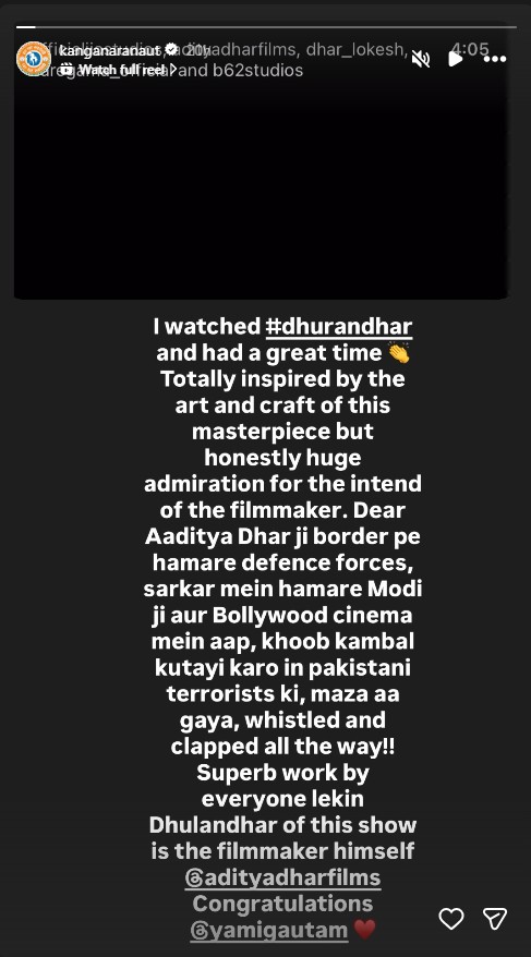 Actor and politician Kangana Ranaut is the latest to share her reaction to the film. The ‘Tanu Weds Manu’ actor took to Instagram Story to heap praise on director Aditya Dhar and called him the real “Dhurandhar” of the Ranveer Singh-starrer. Kangana also added she enjoyed watching the film so much that it had her clapping and whistling.