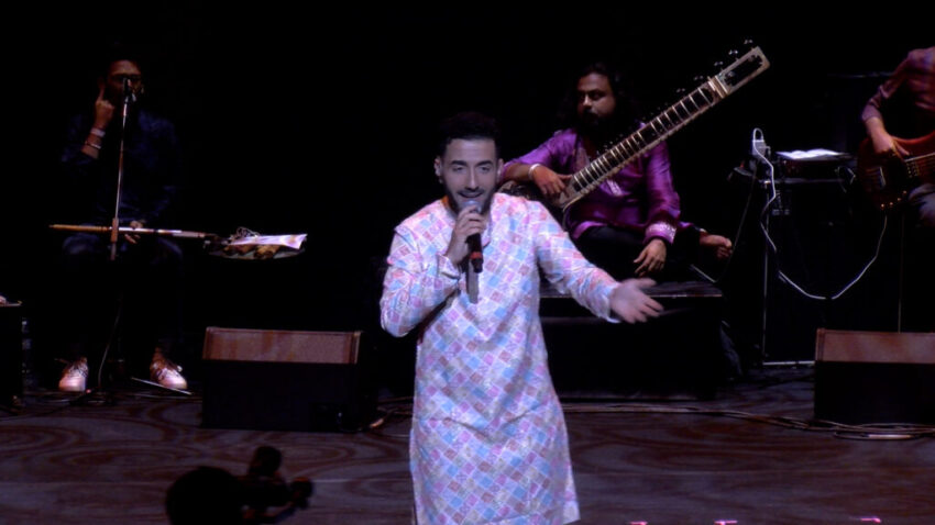 As he walked onto the massive stage where his orchestra was already settled, Abby V shouted, “New Jersey, how are you doing,” and added he was very happy to be there. He immediately engaged the audience to sing with him the Ganapati Abhang, starting with “Ganapati Bappa Morya. Mangala Murti Morya,” which reverberated from the crowd gathered to enjoy his music.