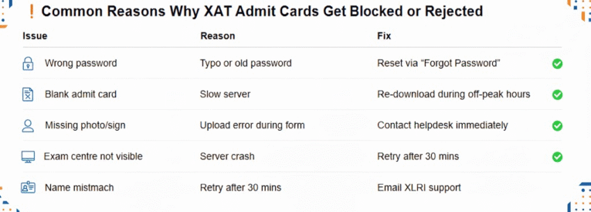 Issue 3: Incorrect Details on Admit Card. Let the XAT authorities know about any mistakes at once. Do not make an attempt to rectify the details on the admit card manually, as this will be considered tampering and can result in disqualification.